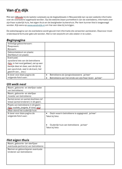 Nabestaanden kunnen zelf informatie voor de website van d'n dijk aanleveren.