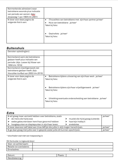 Het is niet verplicht het formulier volledig in te vullen. Daarnaast kunnen nabestaanden zich beperken tot het delen van feitelijke informatie of juist kiezen om ook verhalen over betrokkene toe te voegen. Van beide mogelijkheden zijn voorbeeldportretten te vinden op deze website. Nabestaanden bepalen dus zelf welke informatie wel en niet op de website terecht komt.