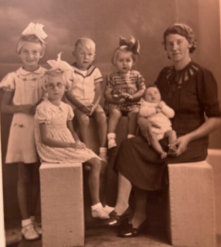 Van links naar rechts: Dick, Dini, Otto, Corry, Miep en moeder Marie