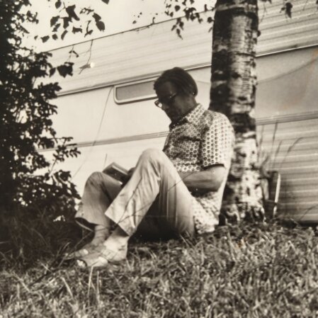Sijb in 1977 op de camping in Prüm. Lezen was naast zijn moestuin zijn grote hobby.