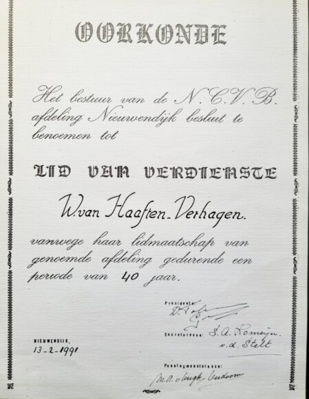 Wegens 40 jaar lidmaatschap van de vrouwenbond werd Mien in 1991 benoemd tot Lid van Verdienste.